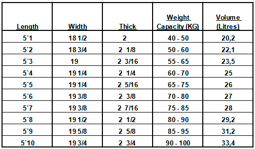 Las tablas de medidas adjuntas a cada modelo de tabla, son orientativas, pues son ligeramente customizables.